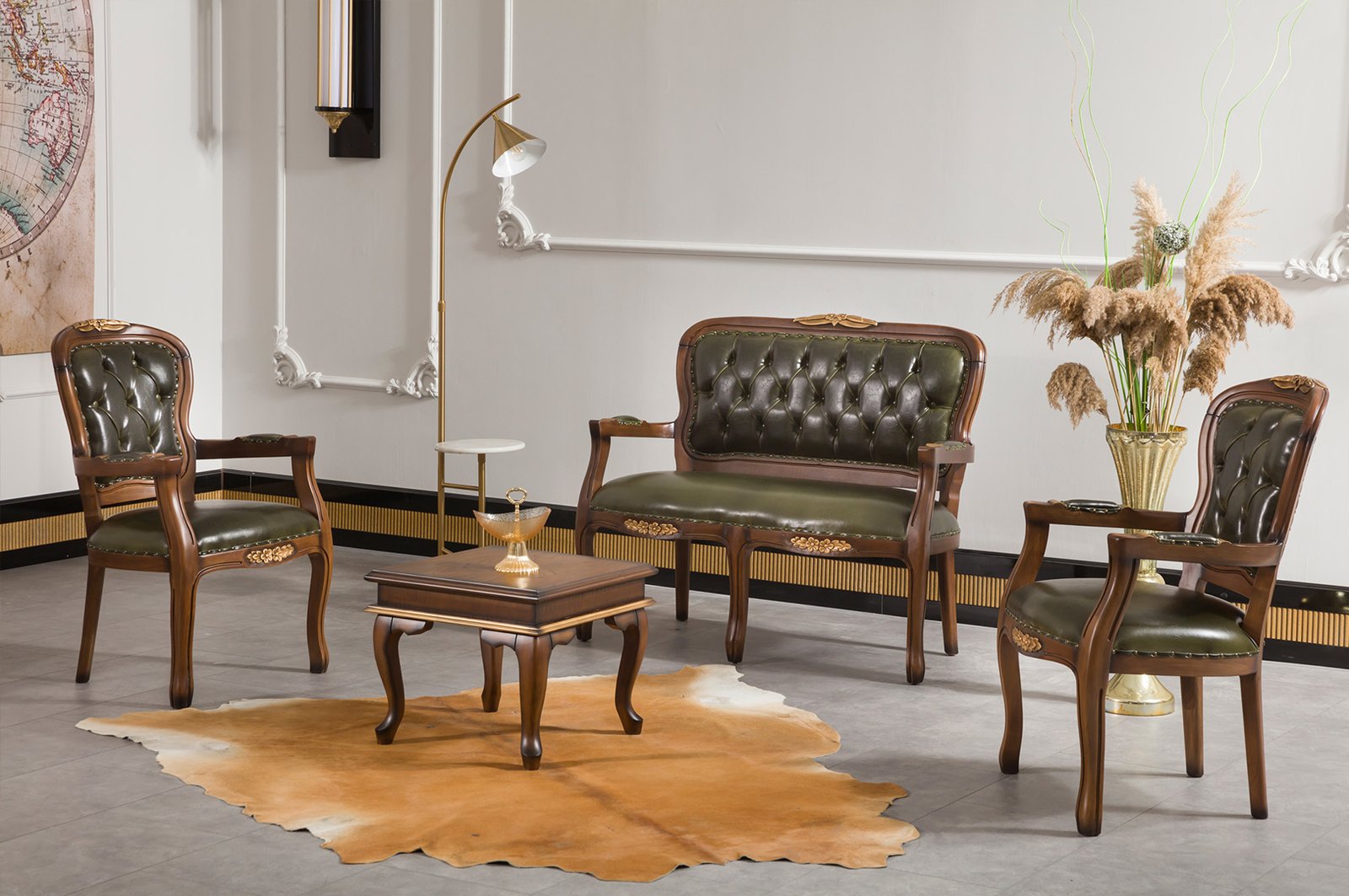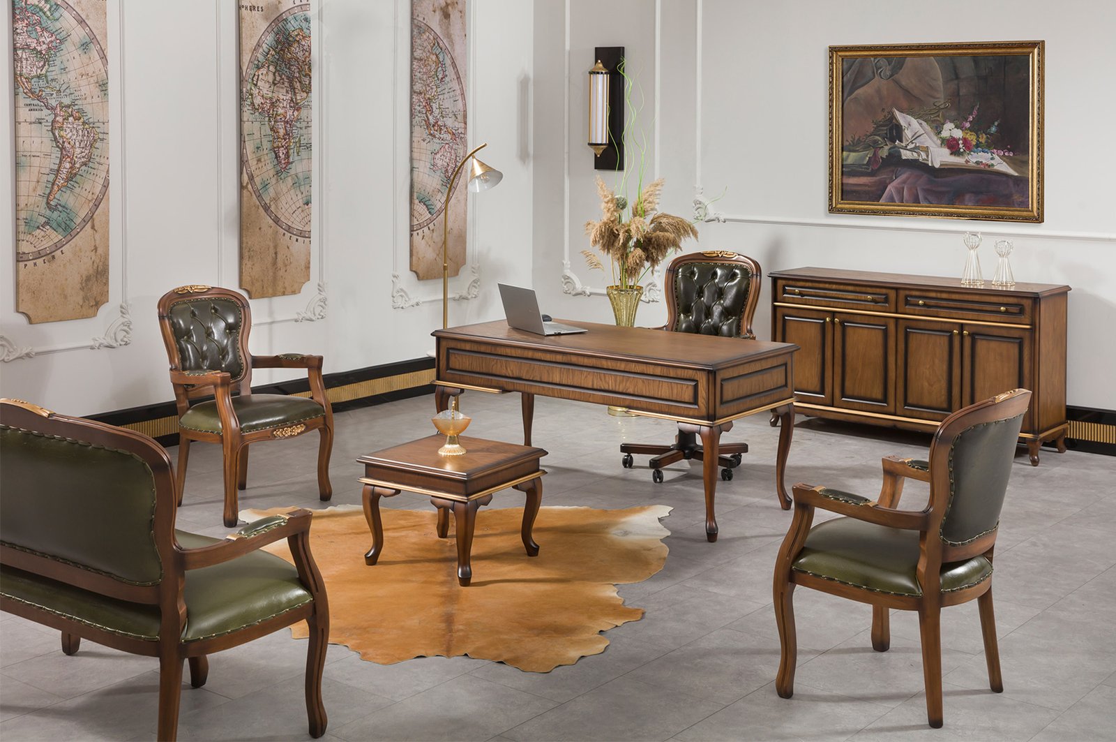 ANTIQ VIP Yönetici Masa Takımı, bilgisayar, evrak ve ofis malzemeleriniz için ideal bir çalışma alanı oluşturur. Dayanıklı ahşap gövdesi uzun ömürlü kullanım sağlarken, cam kaplama yüzeyi şık bir görünüm sunar. Dolap, etajer ve yan sehpalar, belgeleriniz ve aksesuarlarınız için geniş depolama alanı sağlar. Kompakt boyutları küçük ofislerde bile verimlilik ve estetik dengesi kurar.