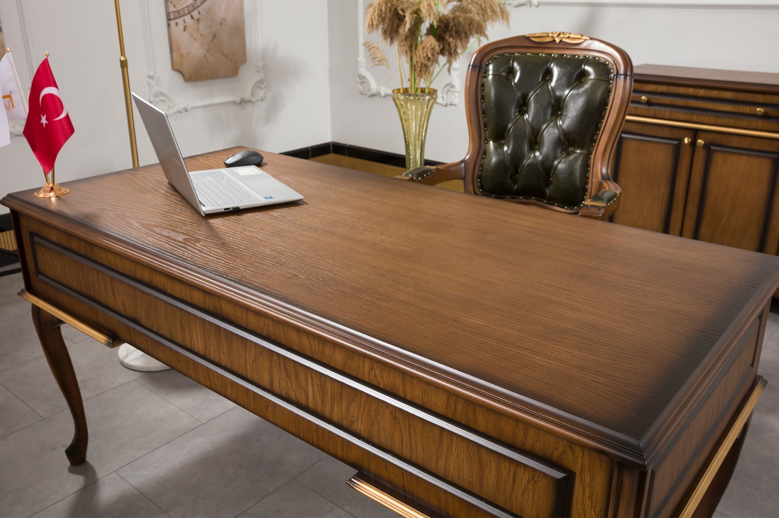 Koca Ofis Mobilya güvencesiyle üretilen ANTIQ VIP yönetici masa takımı, düzenli ve fonksiyonel bir çalışma ortamı için mükemmel bir seçimdir.