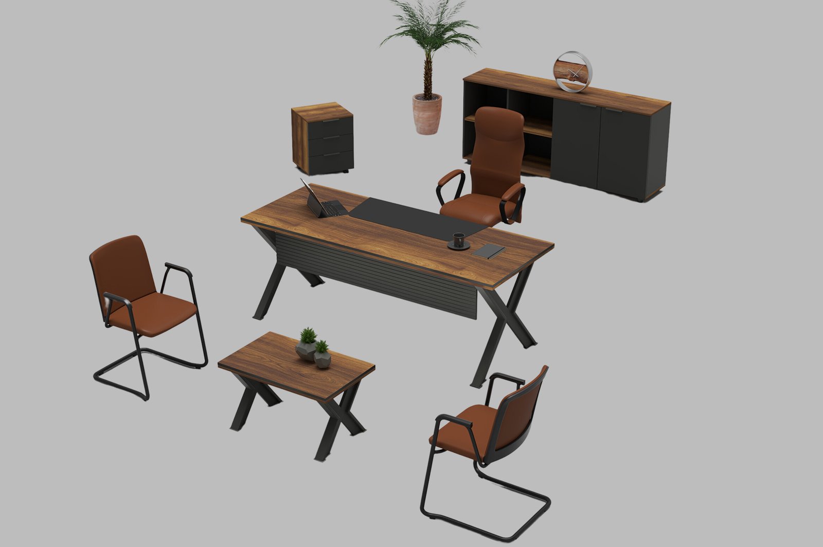 Üretiminde kullanılan kaliteli ahşap malzeme, dayanıklılık ve uzun ömürlü kullanım imkânı sunarken; masa yüzeyindeki zarif cam detay modern bir dokunuş sağlar. Ergonomik tasarımı sayesinde çalışanlara konforlu bir kullanım sunan bu takım, şıklığıyla da ofis dekorasyonuna değer katar.