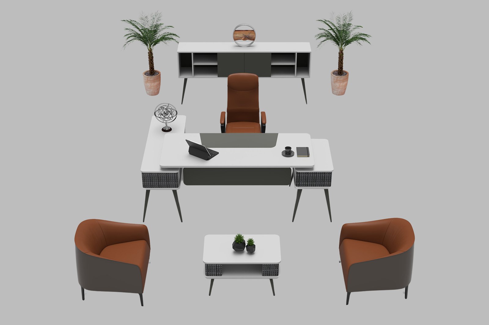 Masada bulunan geniş depolama alanları, çekmece ve dolap bölmeleri, belgeler ve ofis eşyalarının düzenli saklanmasına olanak tanır. Sehpa bölümü misafir ağırlamalarında şıklığı ön plana çıkarırken, dolap kısmı ofisin düzenini tamamlar. Tüm bu parçalar, yönetici ofislerine profesyonel bir kimlik kazandırmak için özel olarak tasarlanmıştır.