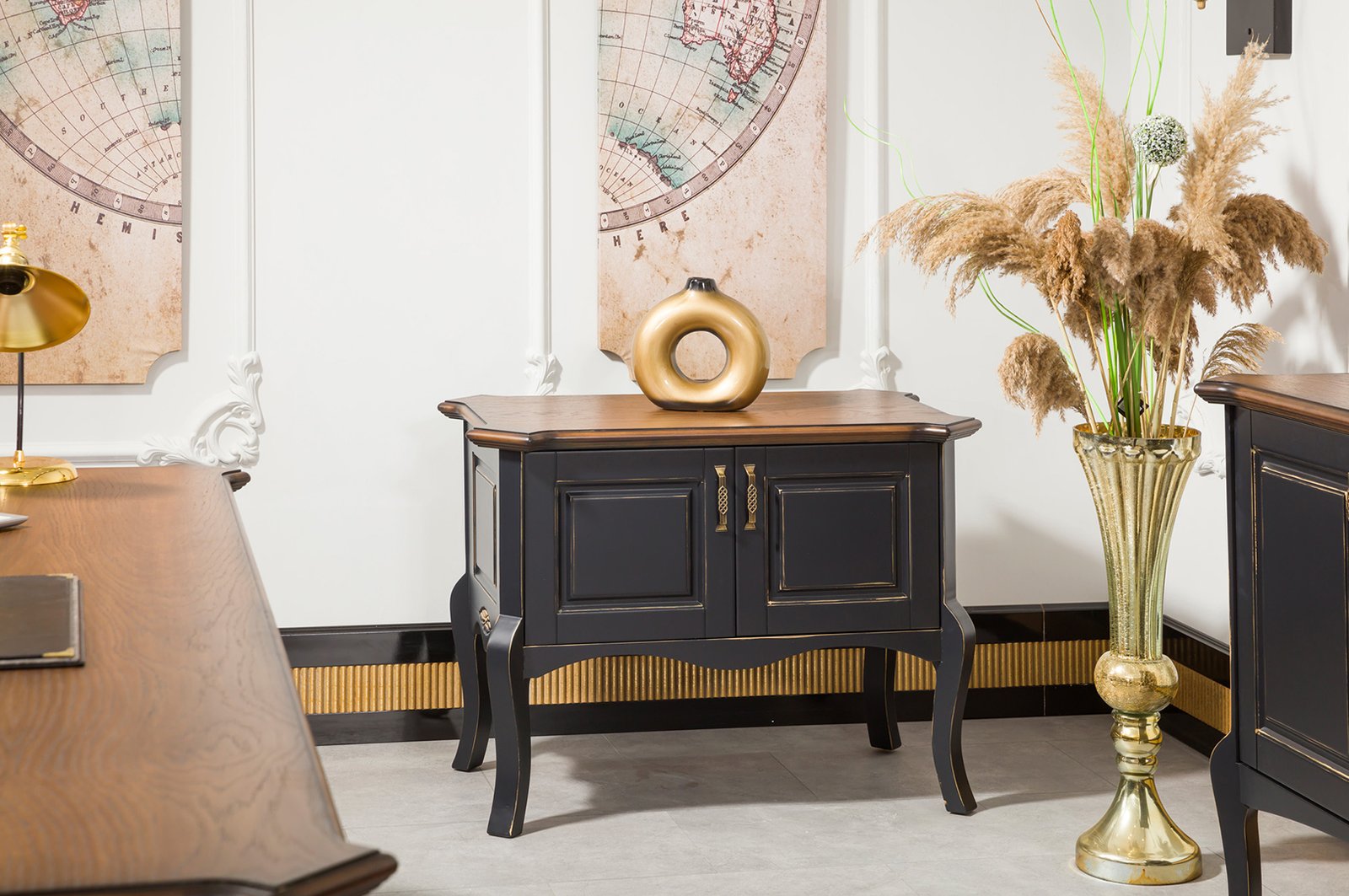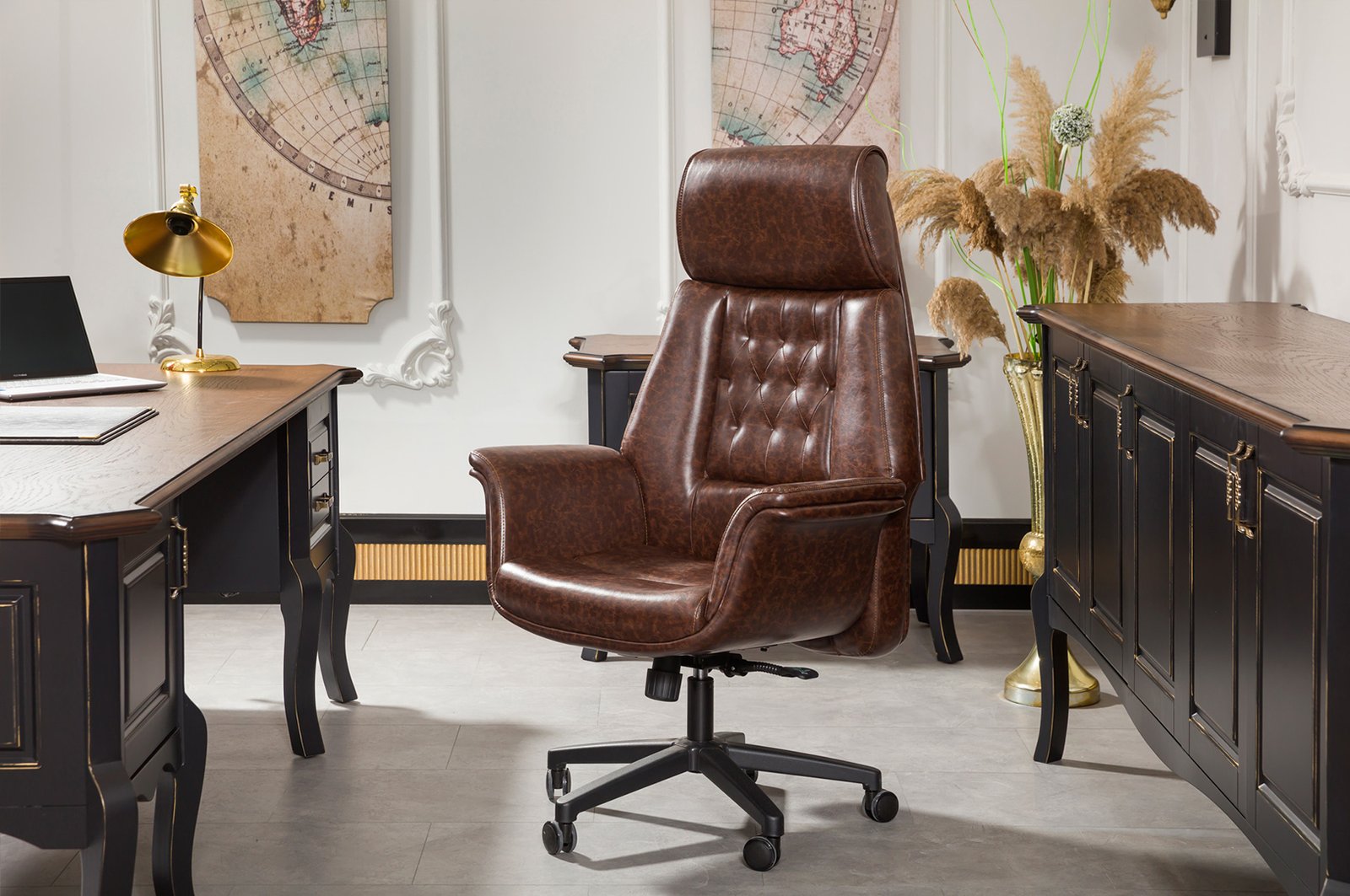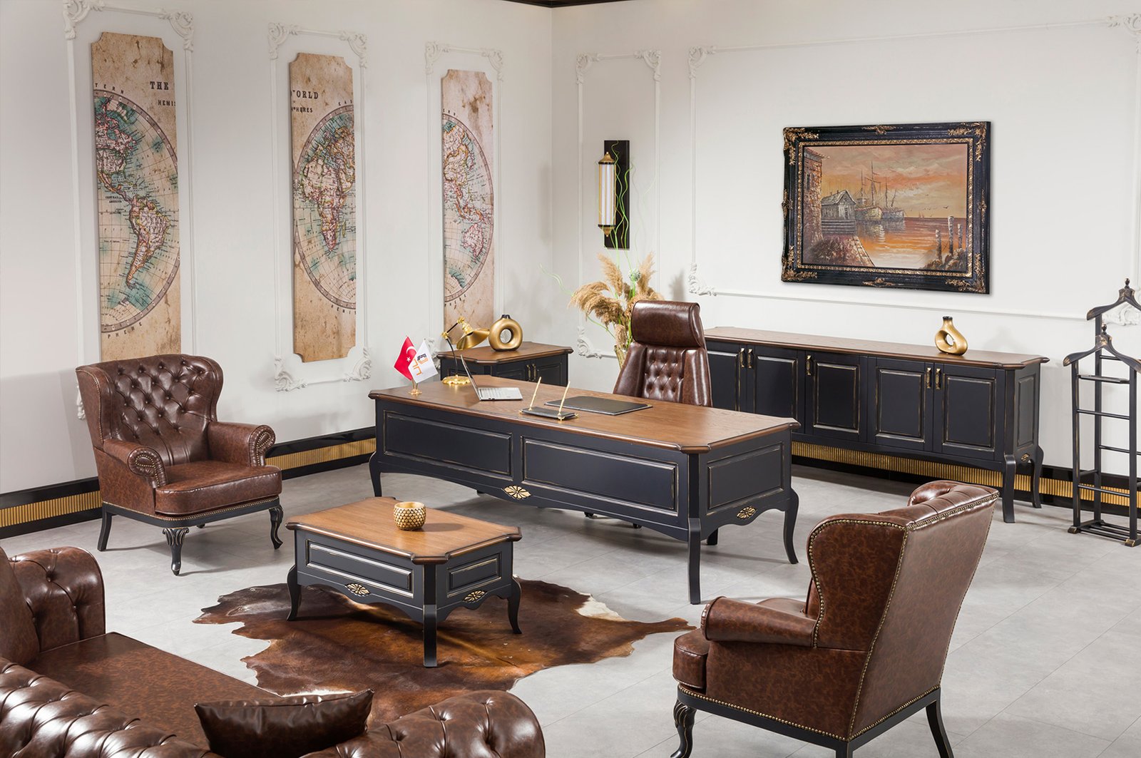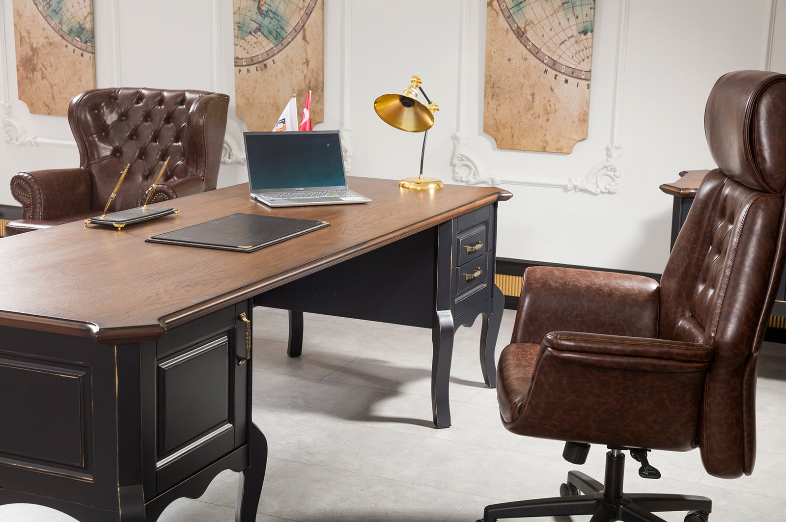 NUSS VIP Yönetici Masa Takımı, geniş masa yüzeyiyle bilgisayar, evrak ve çevre birimleri için düzenli bir çalışma ortamı sunar. Etajer ve dolap modülleri belge, kırtasiye ve kişisel eşyalar için pratik depolama imkânı sağlar. Dayanıklı ahşap gövde uzun ömürlü kullanım vadederken, zarif yüzey geçişleri mekân bütünlüğünü güçlendirir. Orta ve yan sehpalar, misafir ağırlama ve toplantı öncesi hazırlıklar için ek alan yaratır.