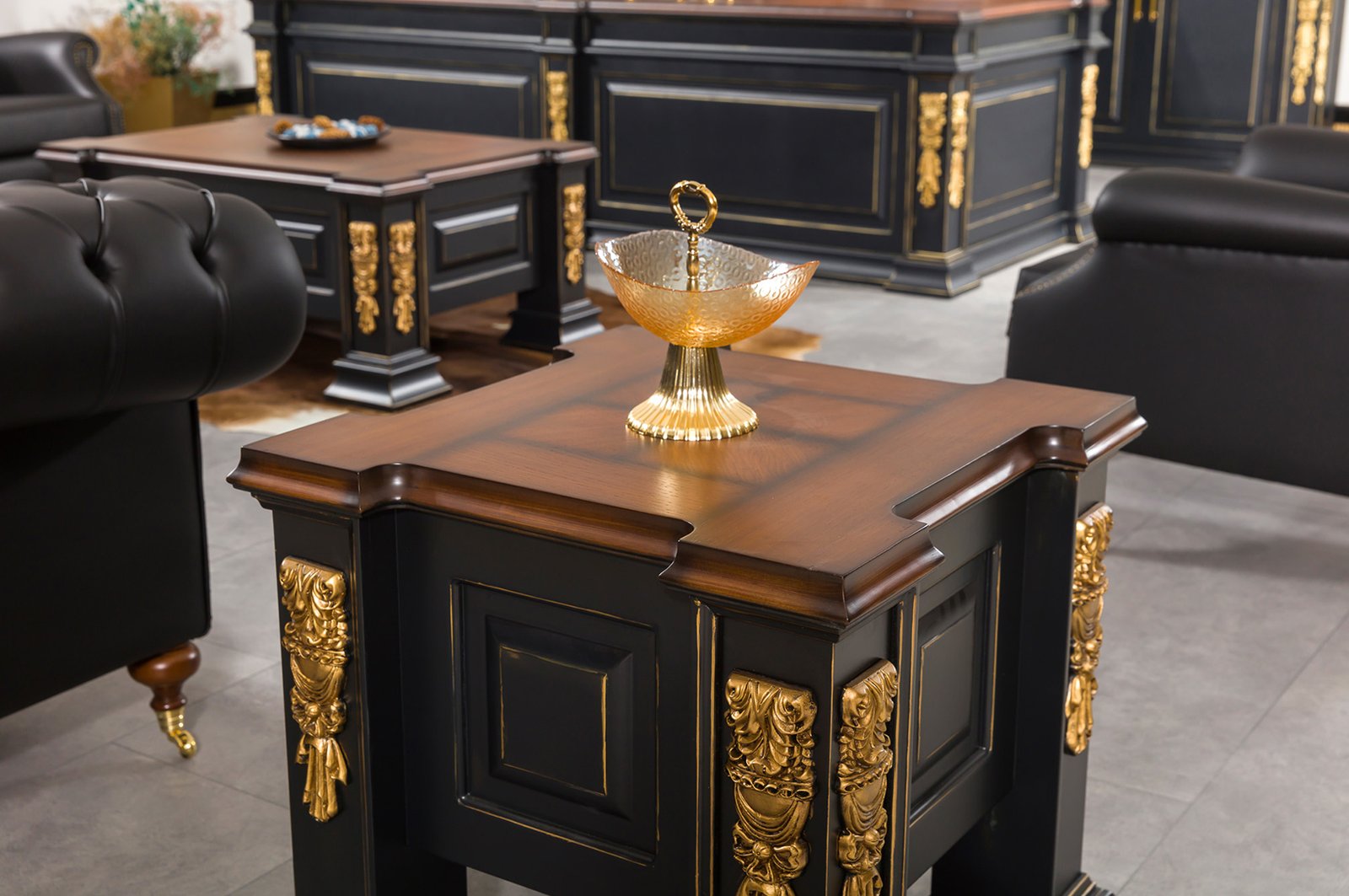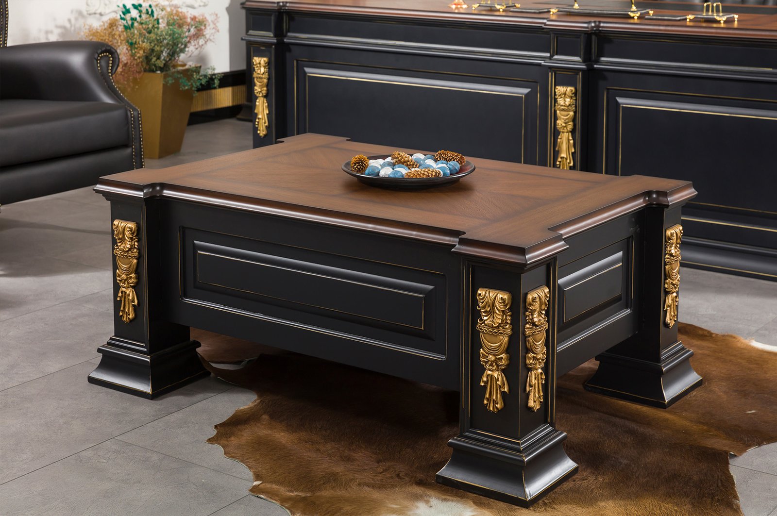 Sağlam ahşap gövdesi ve zarif cam kaplaması, hem dayanıklılık hem de şıklığı bir arada sunar. Takımın içerisinde masa, dolap, üst dolap, etajer, sehpa ve koltuk seçenekleri yer alarak çalışma alanınızı tam anlamıyla bütünler. Roma VIP yönetici masa takımı, modern çizgileri ve ergonomik tasarımı sayesinde ofisinizde profesyonel bir atmosfer yaratır. Bu özel tasarım, yalnızca bir mobilya değil aynı zamanda iş yaşamında prestijinizi yansıtan güçlü bir simgedir.