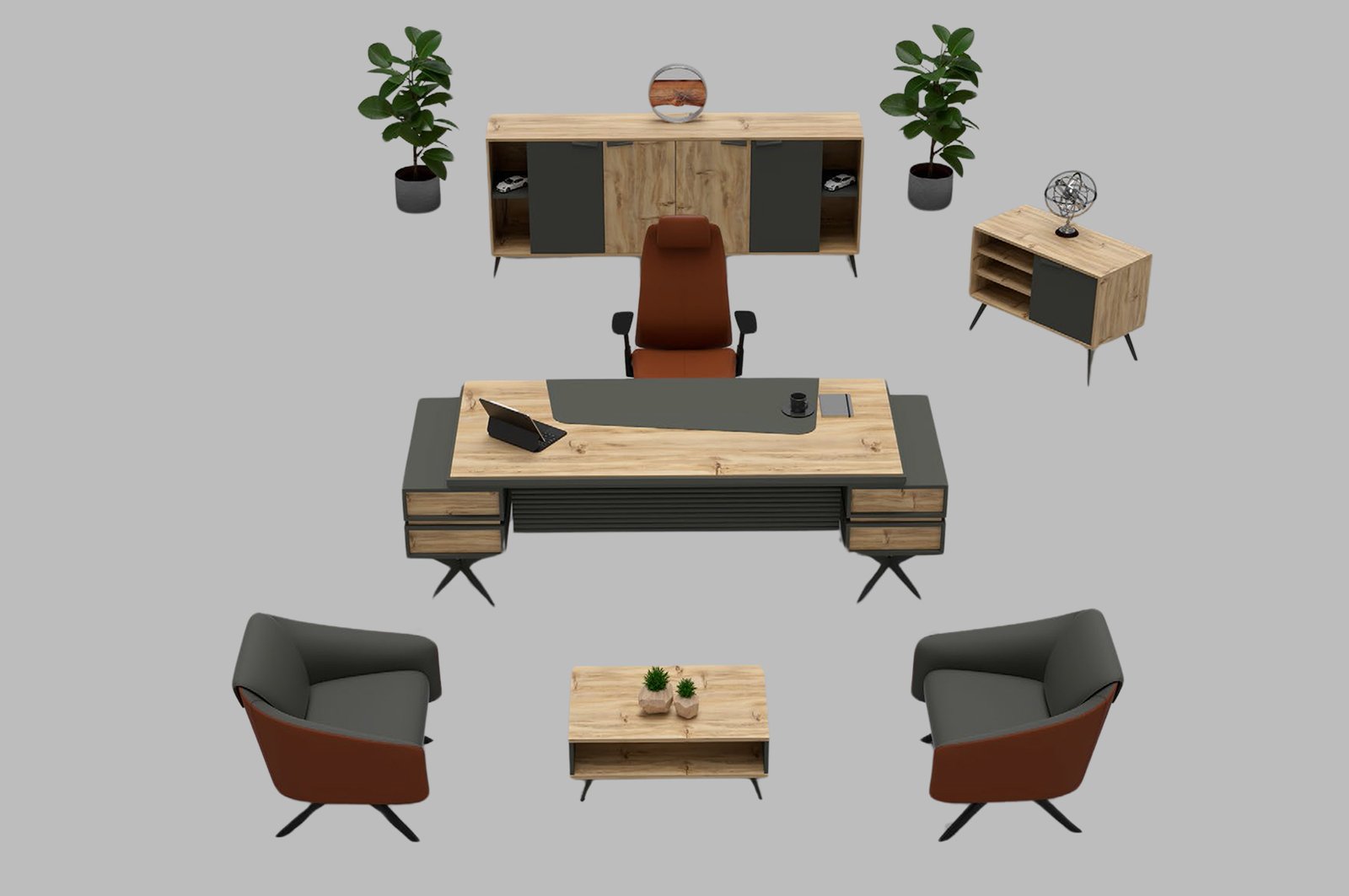 Takım içerisinde yer alan masa, dolap, sehpa ve etajer; günlük iş akışınızı kolaylaştıracak şekilde düşünülmüştür. Masanın geniş yüzeyi bilgisayar, evrak ve ofis aksesuarları için ideal bir çalışma ortamı sunarken, dolap bölümü ofis düzenini korumak için geniş depolama alanı sağlar. Sehpa ve etajer ise hem işlevsellik hem de tasarımı tamamlayıcı bir unsur olarak öne çıkar.