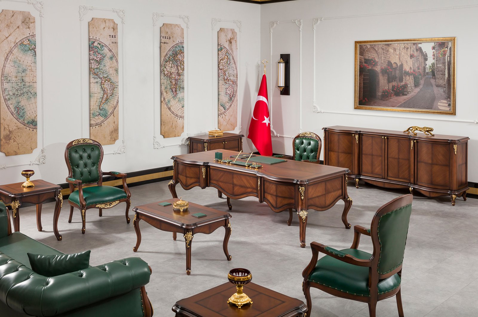 Zebra–Mat VIP yönetici masa takımı, modern çizgileri ve zarif detaylarıyla üst düzey yöneticiler için tasarlanmış prestijli bir ofis mobilya setidir. Sağlam ahşap gövde ile cam yüzeyin şık birlikteliği, uzun ömür ve premium bir görünüm sunar. Set; geniş çalışma masası, dolap, etajer, orta sehpa, iki adet yan sehpa, toplantı masası ve koltuk gruplarından oluşur. Bu kapsamlı kombinasyon, hem günlük çalışma düzenini kolaylaştırır hem de misafirlerinizi etkileyici bir ortamda ağırlamanızı sağlar.